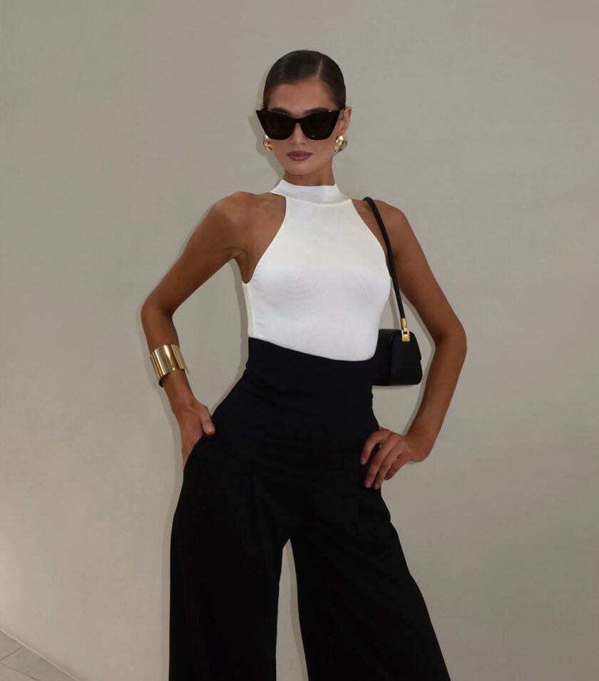 A cropped viscose top with a clean halter neckline, designed for a smooth fit and refined silhouette. Lightweight, soft on the skin, and perfect for effortless day-to-evening styling. Length 36 cm.