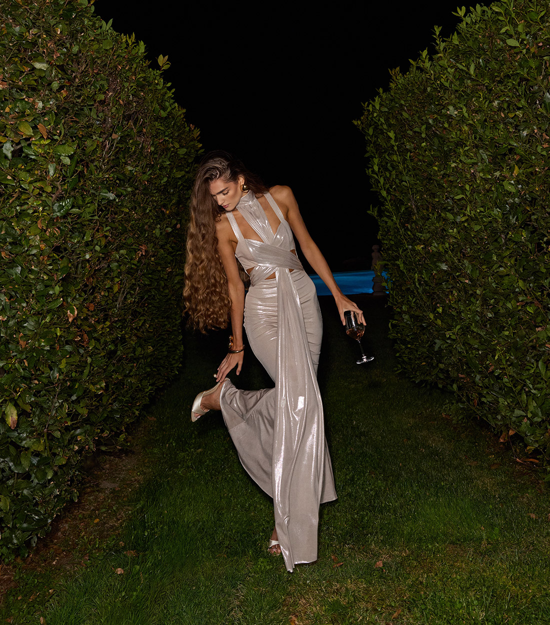 A statement gown designed for unforgettable moments. Its sculpting silhouette, shimmering finish and artfully placed cut-outs create a look of confident evening elegance. This dress features a natural fabric lining that not only enhances the silhouette but also ensures exceptional comfort.