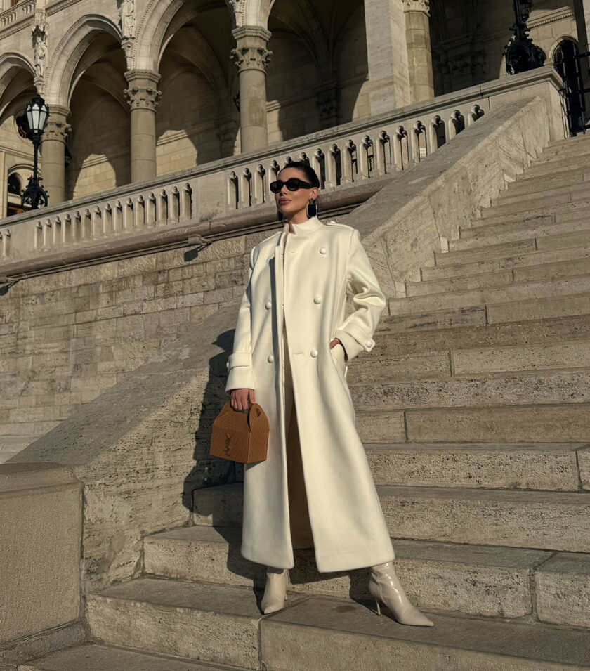 A true masterpiece of refined minimalism. This long double-breasted coat is crafted from a premium blend with 50% wool and a natural fabric lining that ensures softness, comfort and breathability. We spent months perfecting its design to achieve the ideal balance between structure and fluidity, creating a silhouette that feels timeless, feminine and effortlessly elegant.