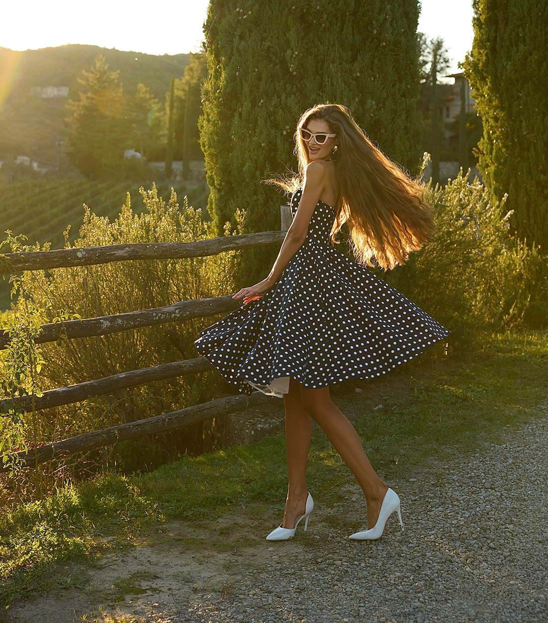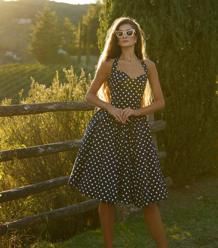 A timeless polka dot dress crafted from breathable cotton, reimagined for the modern summer wardrobe. The corset-style bodice with a structured neckline defines the waist, while the flared skirt creates graceful movement with every step.