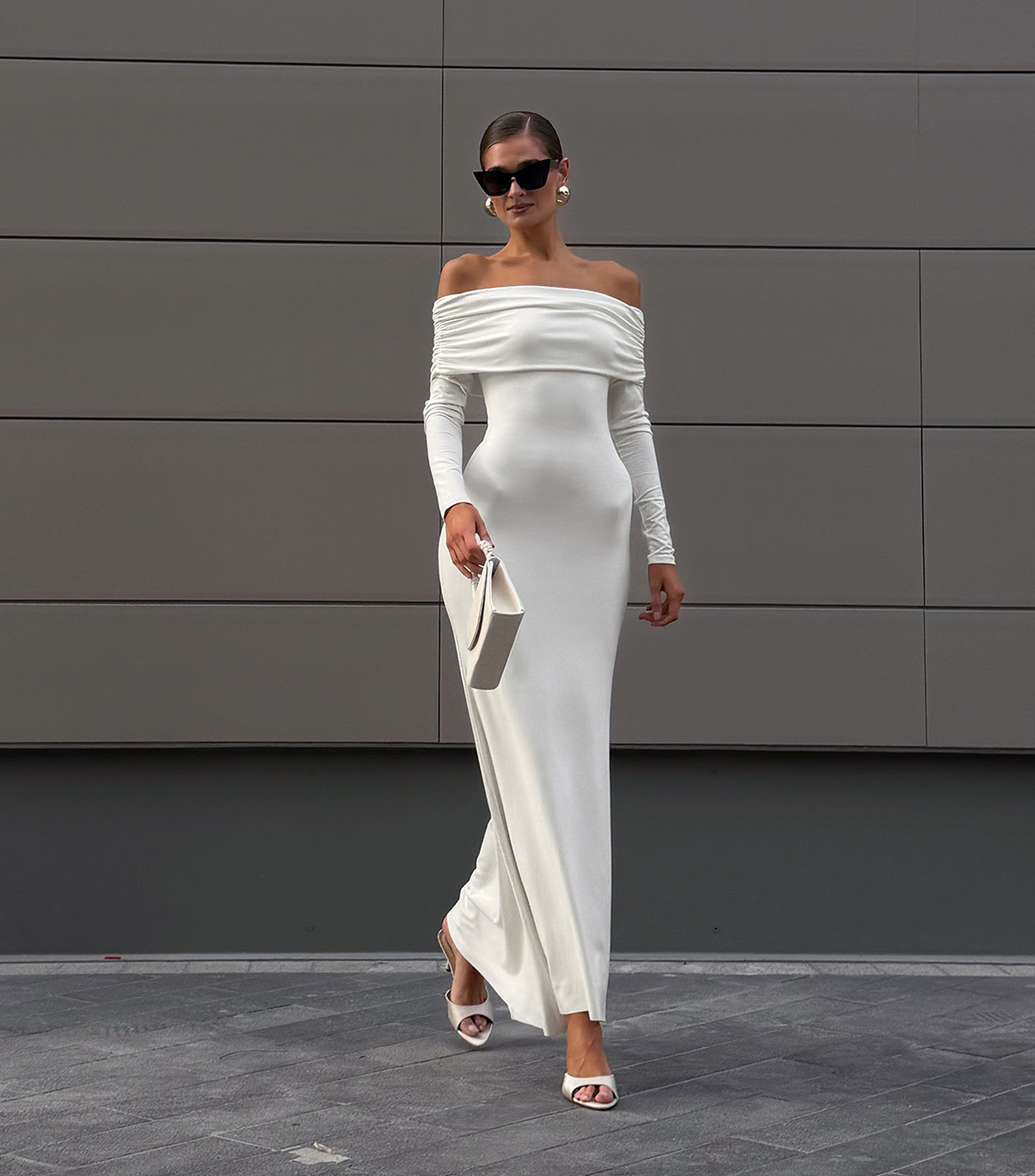 Softly draped fabric enhances the silhouette, highlighting the shoulders and waist. Elegant, breathable, and timeless.
